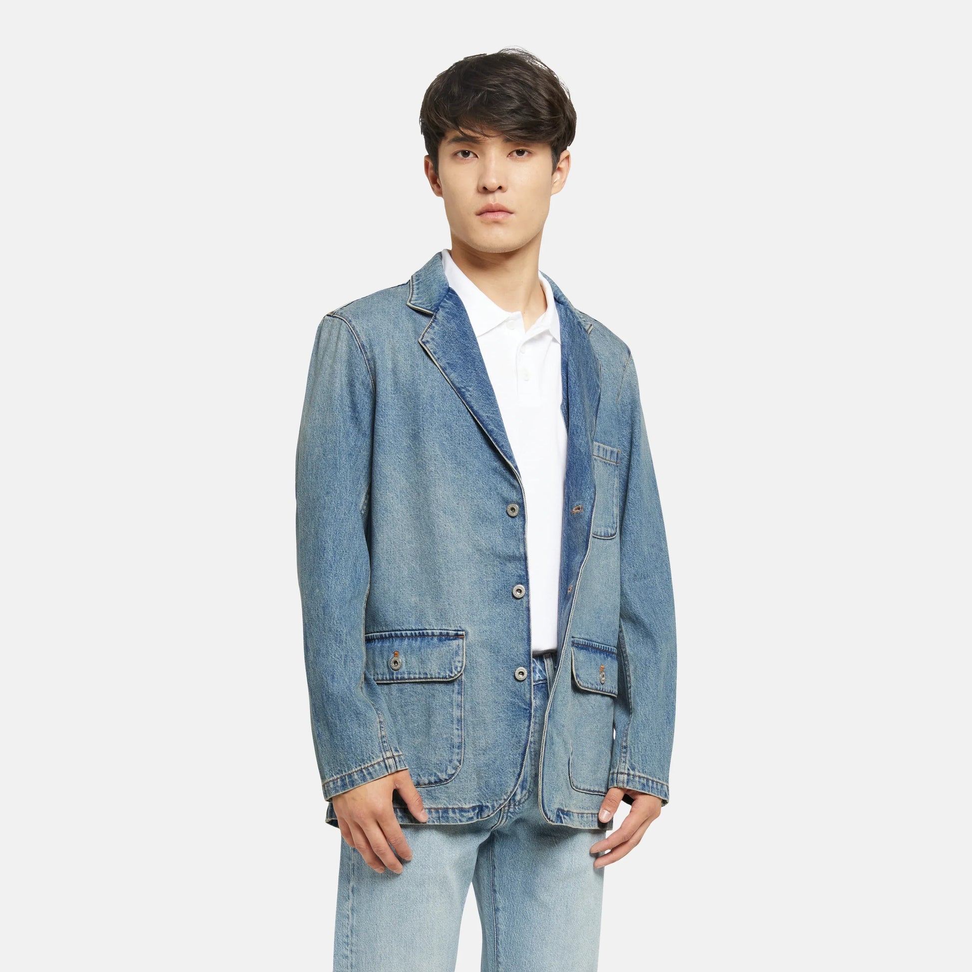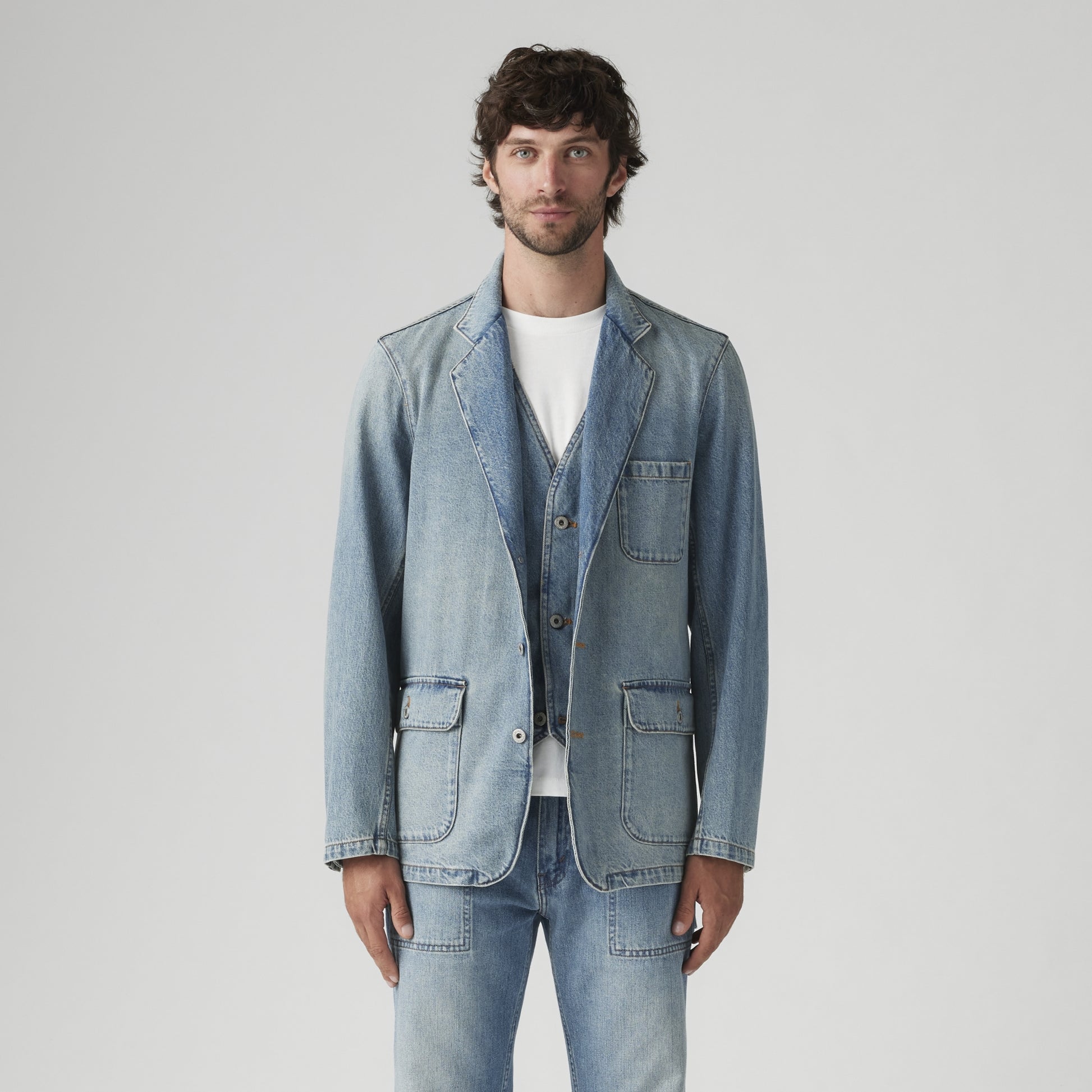 An essential blazer. Our Mission Denim Blazer is made with classic denim and features a button-up front with an easy, standard fit.